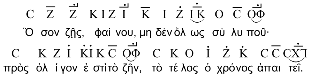 L’épitaphe de Seikilos est également une des plus vieilles mélodies écrites connues à ce jour. Les paroles de cette chanson sont gravées sur une colonne de marbre. La mélodie est codée par des lettres écrites au-dessus des paroles et surmontées de signes indiquant la durée des notes. Cette stèle date du I er ou II ème siècle av JC.